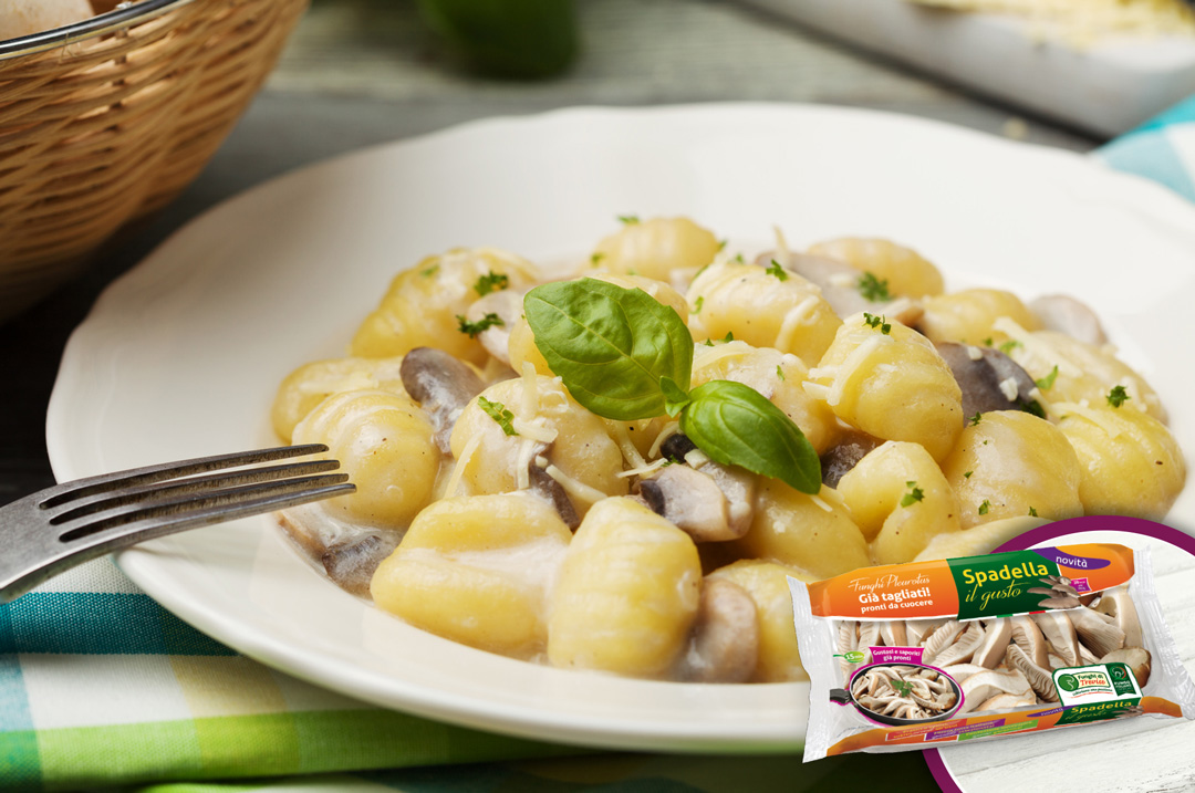 Portate a ebollizione abbondante acqua salata e cuocete gli gnocchi, una volta venuti a galla, scolateli direttamente nei funghi, aggiungete la crema di formaggio, aggiustate di sale e pepe e mantecate per 1 minuto in modo da amalgamare bene i sapori.