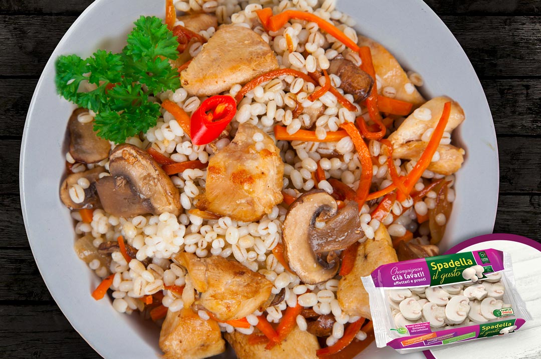 In una pentola antiaderente fate rosolare gli spicchi d’aglio per un paio di minuti con l’olio extravergine di oliva. Aggiungete gli Champignon Spadella il gusto, il pollo tagliato a dadini e fateli insaporire per qualche minuto. Unite l’orzo e un pizzico di sale, quindi, iniziate ad aggiungere poco per volta il brodo vegetale. Fate cuocere per 15 minuti, finché l’orzotto non sia bello al dente. Guarnite in ultimo con il prezzemolo e la carota tritata finemente. Un piatto leggero per l’estate pronto per essere servito: buon appetito!