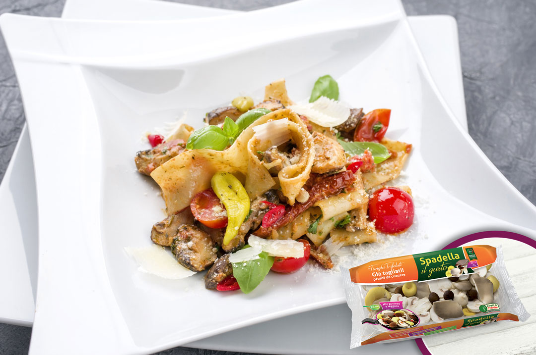Lavate i pomodorini e tagliateli in quattro parti e mentre l’acqua della pasta bolle, preparate il condimento: fate scaldare in una padella l’olio, l’aglio e il peperoncino tritato, unite i Funghi trifolati Spadella il gusto e fateli saltare per un paio di minuti. Aggiungete i pomodori e un mestolino di acqua delle cozze. Quando i pomodorini saranno appassiti, aggiungete anche le cozze, bagnando il tutto ancora con un po’ di acqua di queste ultime. Nel frattempo, bollite la pasta, scolatela al dente e trasferitela nella padella del condimento. Aggiungete il prezzemolo fresco e… voilà il pasto è pronto per essere servito!