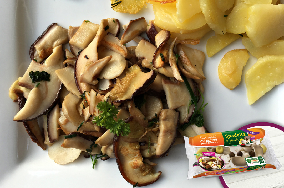 Fate cuocere le patate per 15 minuti circa, quando saranno quasi pronte, aggiungete i funghi. Aggiustate di sale e pepe e fate cuocere per altri 5/10 minuti a fiamma bassa, quando le patate avranno la crosticina spegnete il fuoco.