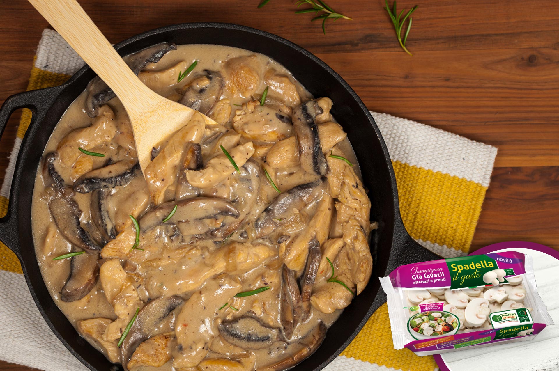 Taglia il pollo a pezzettoni, affetta lo scalogno finemente e apri la confezione di Champignon affettati Spadella il gusto. Scalda un filo di olio in una padella capiente, meglio se in un wok, aggiungi lo scalogno e una volta dorato anche il pollo e i funghi.