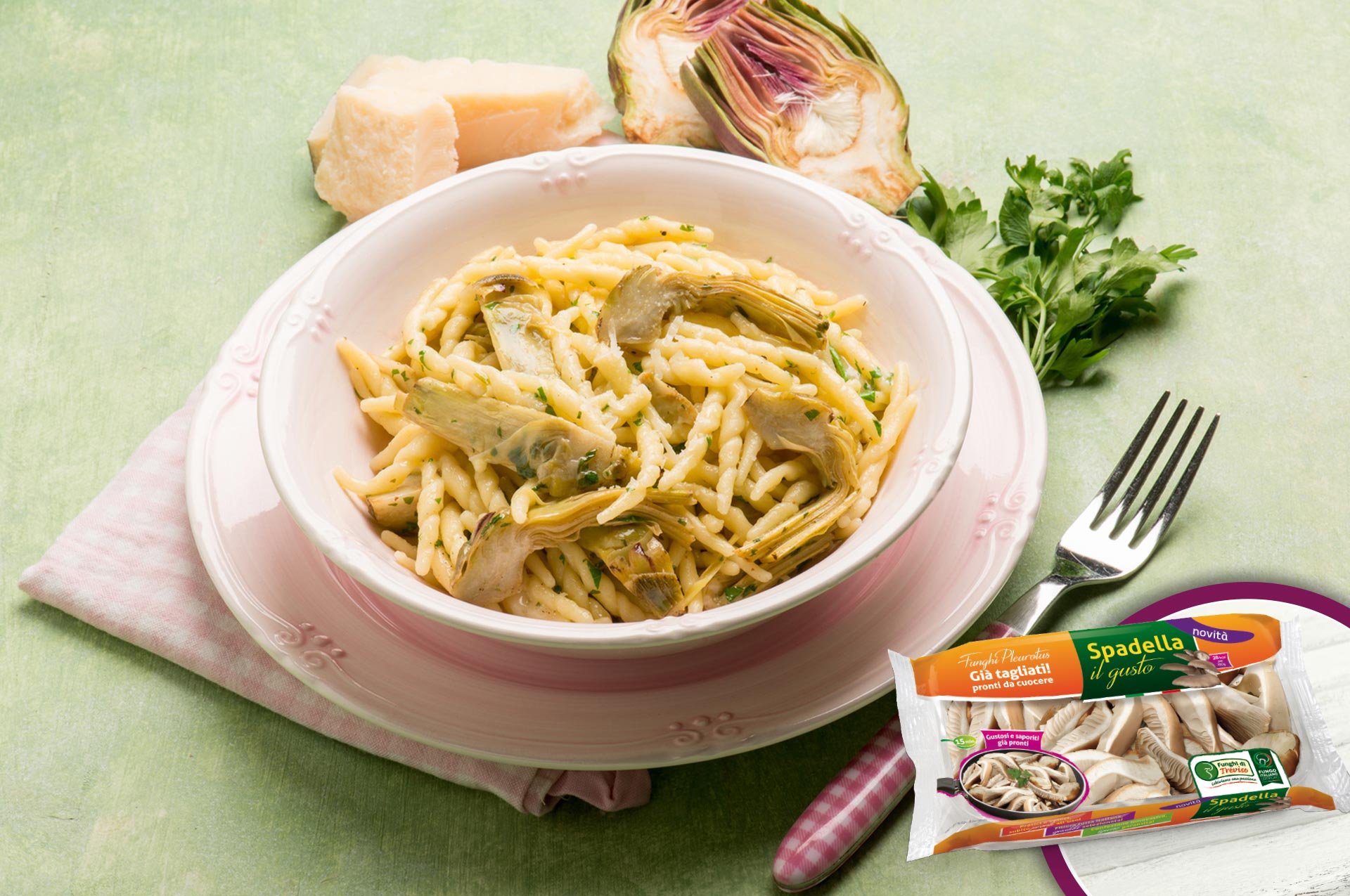 Pulisci e taglia le verdure: i carciofi a tocchetti e i Funghi Pleurotus Spadella il gusto a listarelle. In una pentola capiente scalda un filo d’olio con uno spicchio d’aglio, salta i carciofi insieme ai funghi e regola di sale e pepe. Una volta cotti elimina lo spicchio d’aglio e aggiungi una manciata di prezzemolo tritato.