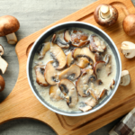 Tritare i funghi e pulire i porri privandoli delle radici, della parte verde, delle foglie esterne più dure e lavarli. Sbucciare la cipolla, lavarla e tagliarla a rondelle sottili insieme ai porri. Privare il sedano dei filamenti, lavarlo e tagliarlo a striscioline. Pelare la patata, lavarla e tagliarla a dadini. Lavare il prezzemolo e tritarlo. In un tegame versare 2 cucchiai di olio, aggiungere gli ortaggi e far cuocere a fuoco dolce, per circa 10 minuti, mescolando di tanto in tanto. Aggiungere i funghi tritati e, dopo 2 minuti, versare il brodo; portare a ebollizione e continuare la cottura per circa 30 minuti. Lasciar intiepidire il brodo e passarlo al passaverdure. Metterlo di nuovo sul fuoco; unire la panna, il sale e il pepe e farlo scaldare. Mescolare e versare la zuppa in 4 ciotole. Guarnire con il formaggio grattugiato e il prezzemolo tritato.
